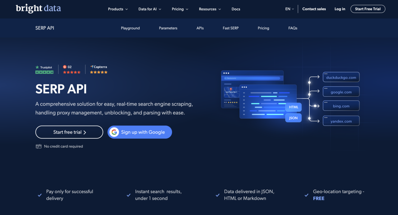 - Pros: Ultra-fast infrastructure; incredible success rates for Google, Bing, and other major engines; excellent “Playground” for testing.